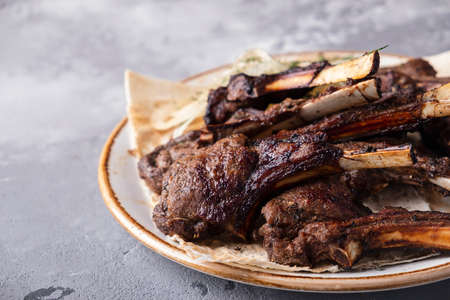 Roasted lamb ribs with vegetables in a bowl, top view.