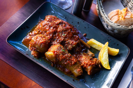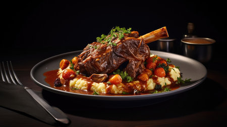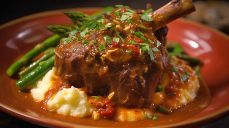 Homemade braised lamb shanks with sauce and herbs Generative AI