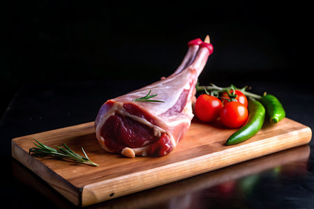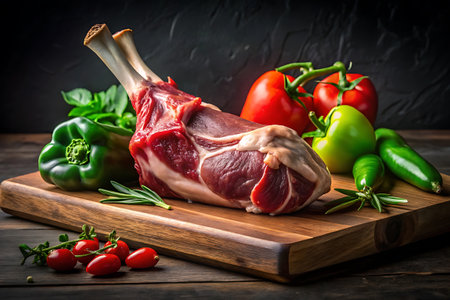 A close-up image of a raw lamb shank placed on a wooden cutting board, surrounded by fresh tomatoes, cucumbers, and green peppers. The dark background highlights the vibrant colors of the vegetables and the meat, creating a visually appealing culinary scene.