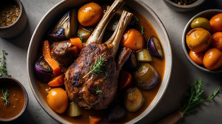 Indulge in a delightful roasted lamb leg paired with fresh vegetables, seasoned with herbs. A perfect dish for a cozy dinner or festive occasion.