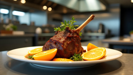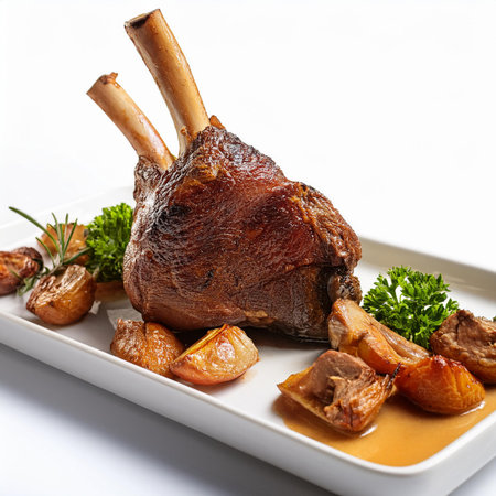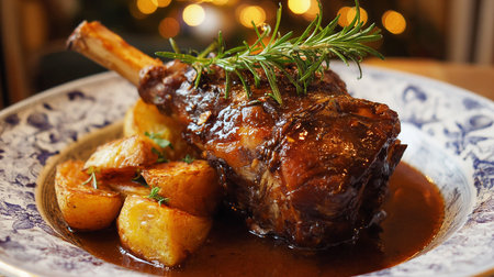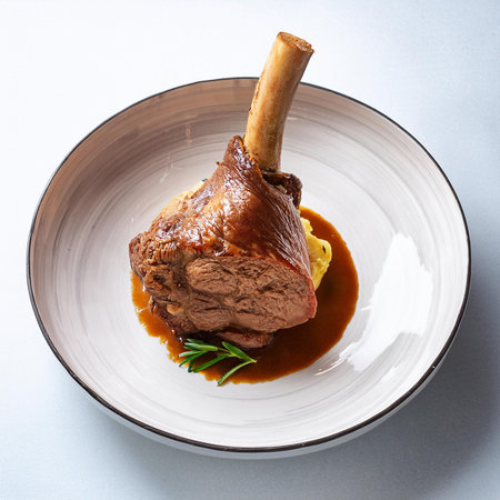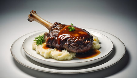 A mouthwatering lamb shank glazed with a rich sauce, garnished with fresh herbs, perfect for showcasing culinary delights. Ideal for food lovers.