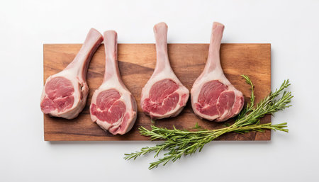 A close-up image of a raw lamb chop displayed on a wooden cutting board, accompanied by fresh vegetables including tomatoes and peppers, with a sprig of rosemary for garnish.