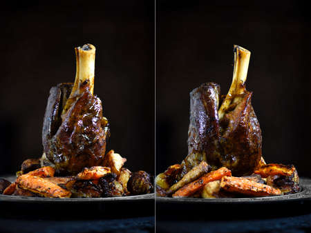 Two image views of roasted lamb shanks with root vegetables of parsnip, carrots and shallots. Selective focus with generous accommodation for copy space.