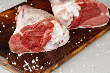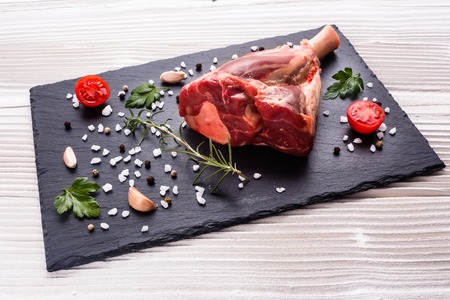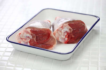 Fresh Raw lamb leg shanks meat in a wooden plate. isolated on white background