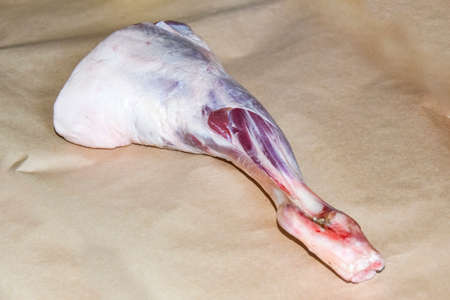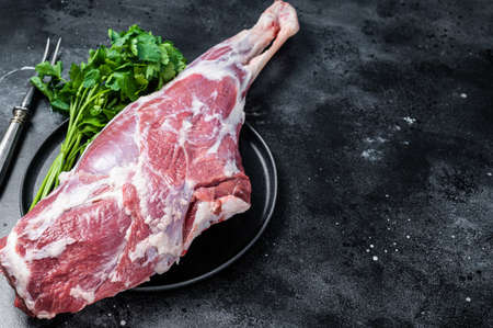 Ready for cooking raw lamb mutton leg with Thigh. Black background. top view. copyspace.