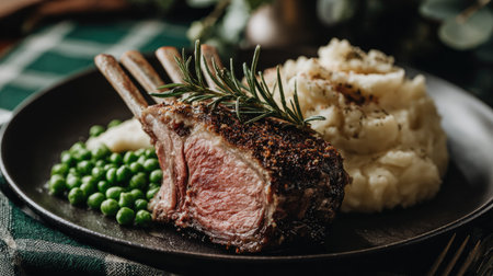 A close-up shot presents a cooked rack of lamb, accompanied by mashed potatoes and green peas. The composition highlights the food's texture and color, set against a dark plate and a green cloth. The lighting suggests an indoor setting, suitable for culinary advertising or editorial purposes.