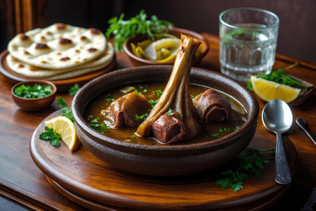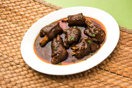 lamb shank or mutton or gosht paya or khoor curry served with indian bread or roti or naan