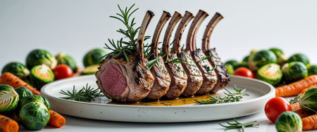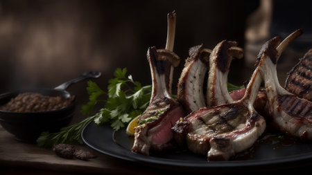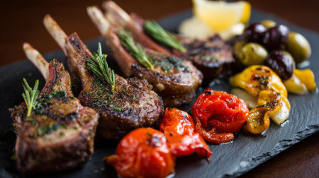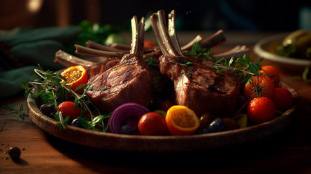 Juicy grilled lamb chops seasoned with fresh herbs and accompanied by vibrant vegetables. Perfect for a gourmet dining experience or culinary presentation.
