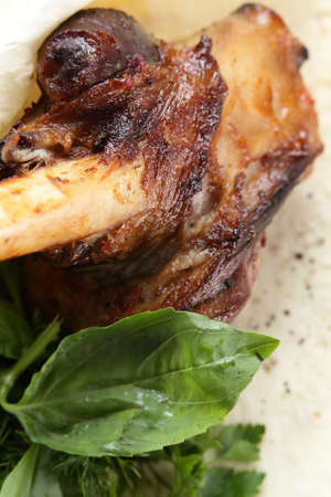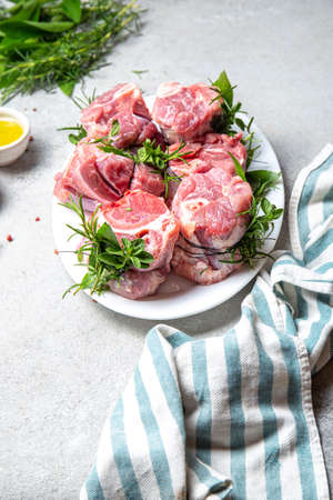 Pork Osso Buco, shin Pork shanks with fresh aromatic herbs on white marmol board