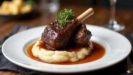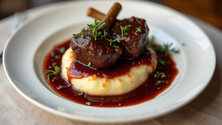 A mouthwatering presentation of tender short ribs glazed in savory sauce, garnished with fresh herbs, perfect for culinary enthusiasts and gourmet cuisine lovers.