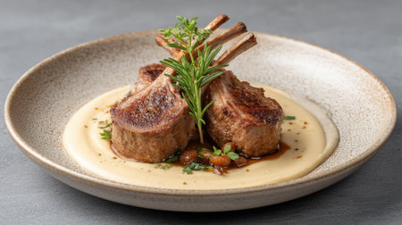 A visually appealing dish featuring tender lamb chops served on creamy mashed potatoes, garnished with fresh herbs and a rich sauce. Perfect for food enthusiasts.