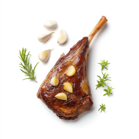 A beautifully roasted lamb leg garnished with garlic cloves and fresh herbs, showcasing culinary artistry on a clean white background for food lovers.