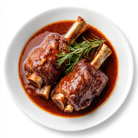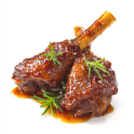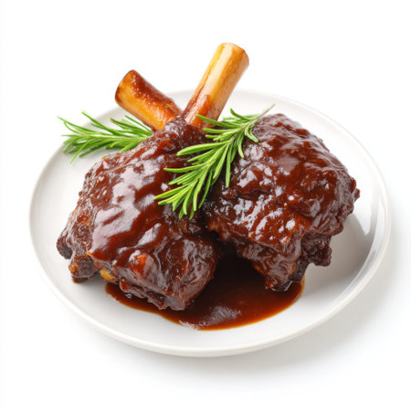 This appetizing image features succulent meat shanks coated in a rich glaze, garnished with fresh rosemary and presented on a crisp white plate.