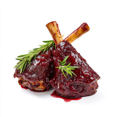 An enticing image of lamb shanks glazed with a rich red berry sauce, adorned with fresh rosemary. This dish showcases culinary excellence and mouthwatering flavors.