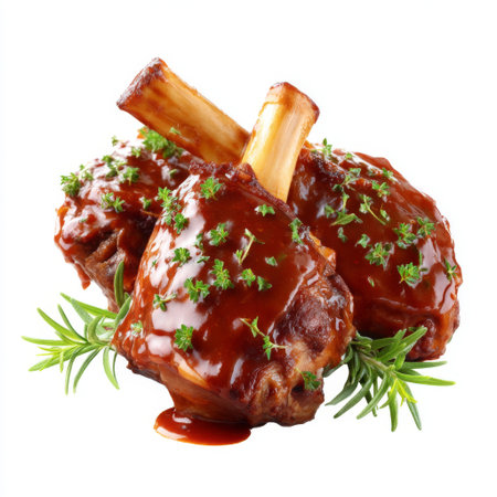 Indulge in a close-up view of succulent meaty ribs smothered in rich barbecue sauce, garnished with fresh herbs. Perfect for culinary enthusiasts.