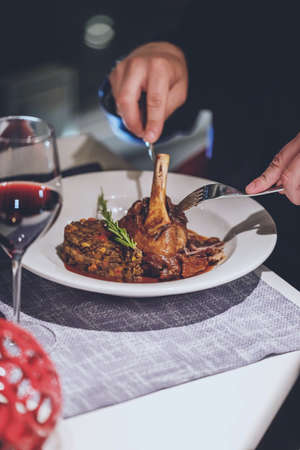 Hands of man eating fine haute cuisine dish at table in restaurant