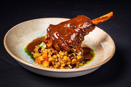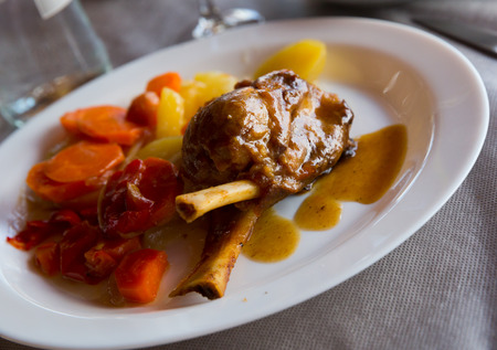 Roasted lamb shank with root vegetables of parsnip, carrots and shallots. Selective focus with generous accommodation for copy space.