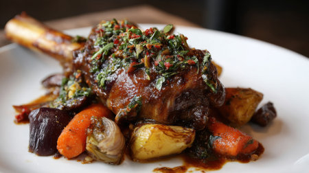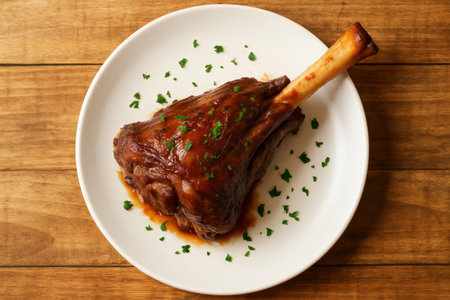 Braised lamb shank served on white plate garnished with fresh chopped herbs on rustic wooden table for gourmet dining experience.