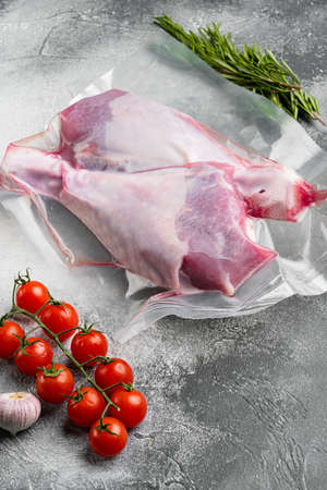 Turkey drumstick meat vacuum pack set, on gray stone table background