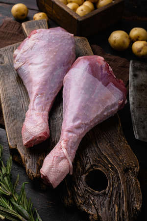 Fresh turkey legs with ingredients for cooking set, on old dark wooden table background