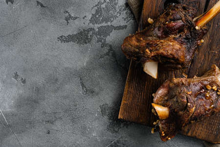 Braised Lamb Shanks with Sauce and Herbs set, on gray stone table background, top view flat lay, with copy space for text