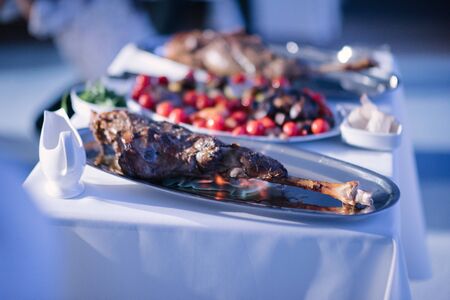 A large, slow-roasted leg of lamb on bed of saffron and white rice, garnished with mint and roasted vegetables. Served on traditional silver platter, this steaming, savory dish is perfect for middle eastern cuisine and holiday themes.