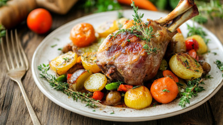 A succulent roasted meat dish served with vibrant vegetables on a rustic wooden table. Perfect for a cozy dinner or festive occasion.