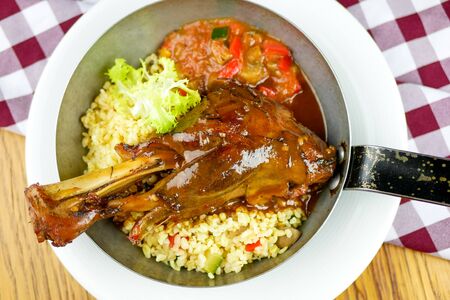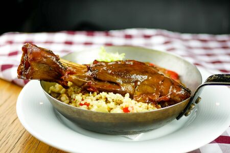 Turkish foods; lamb shank tandoori on bulgur wheat rice (Turkish name; bulgur wheat rice lamb shank tandoori)