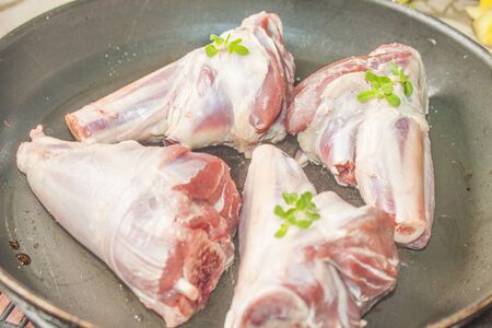 Fresh Raw lamb shanks with herbs and spices, mutton meat. Black background. top view. copyspace.