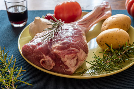A close up of a lamb leg, rosemary, tomato, potato, garlic and pepper in a yellow plate on a table