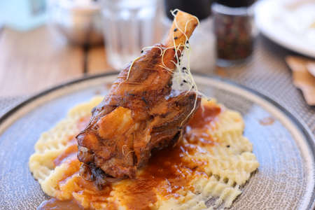 Delicious lamb shank with red wine reduction on creamy mashed potatoes