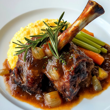 A plate of braised lamb shanks al forno con polenta e rosmarino, featuring tender lamb shanks braised in a rich red wine sauce, infused with rosemary, garlic, onions, carrots, celery, and tomatoes, roasted in the oven until meltingly tender, served over a bed of creamy polenta and garnished with fresh rosemary sprigs, arranged elegantly on a white plate, showing the slow-cooked lamb and the creamy polenta, isolated on clean white background.