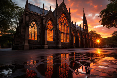 Imposing Gothic Church with stained glass and serene garden., generative AI