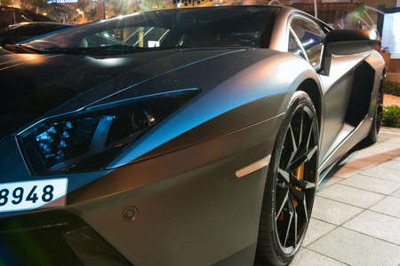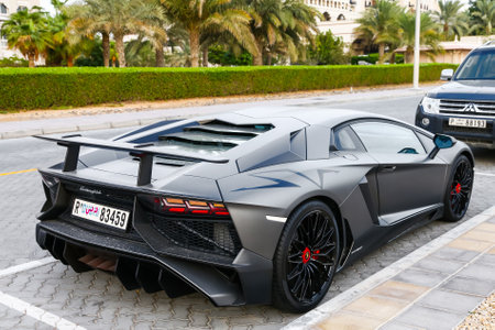 Dubai, UAE - November 16, 2018: Grey supercar Lamborghini Aventador LP 750-4 SuperVeloce in the city street.