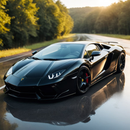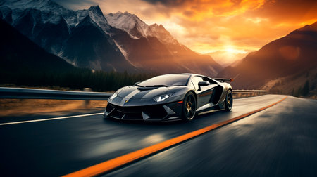 A black sports car speeds down a winding road with sharp turns and scenic surroundings, A luxurious sports car on a spiral uphill road, AI Generated