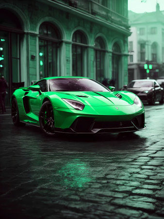 Explore this stunning emerald green performance vehicle with its sleek design, carbon fiber details, and striking blue wheels. A highly detailed rendering of automotive perfection.