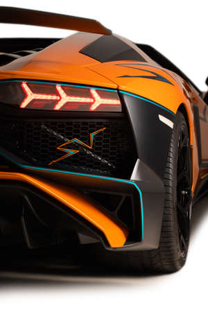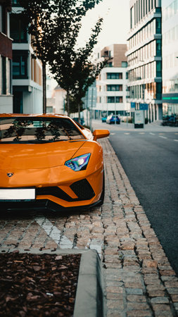Orange Lamborghini Aventador parked in the street. Lamborghini Aventador is a luxury sports car.