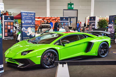 FRIEDRICHSHAFEN - MAY 2019: green lime LAMBORGHINI AVENTADOR LP 750 4 SV 2016 at Motorworld Classics Bodensee on May 11, 2019 in Friedrichshafen, Germany.