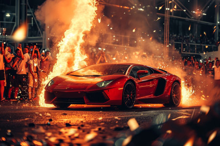 A red sports car stands out amidst a bustling crowd of people, A fiery red sports car in front of a roaring crowd, AI Generated