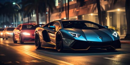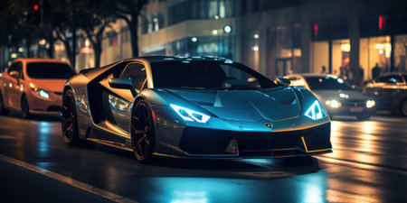 two lamborghini huracan from 1990 engaged in a fierce race, with drivers exchanging intense glances. sparks fly as they speed along a slightly wet track, creating a captivating cinematic shot. the grainy medium format kodak portra 800 film captures the reflections on the cars, adding a touch of nostalgia to this thrilling scene. ai generated