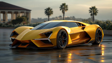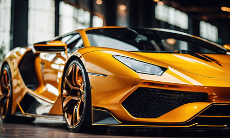 FRANKFURT, GERMANY - SEPT 2019: yellow golden LAMBORGHINI SIAN FKP 37 is a mid-engine hybrid sports car. It is the first hybrid production vehicle produced by the brand, IAA International Motor Show
