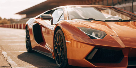 sleek orange sports car with aerodynamic body black alloy wheels and low profile tires parked on racetrack under sunlight showcasing speed style and performance in a high octane automotive environment