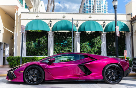 Miami, Florida, USA - July 27, 2025: 2024 Lamborghini Revuelto hybrid supercar coupe car. Luxury sportscar Lamborghini Revuelto. Car Lamborghini Revuelto parked outdoor. Pink car, side view.
