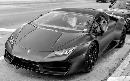Miami, Florida, USA - December 01, 2024: 2018 Lamborghini Huracan sportscar supercar. Sport car of Lamborghini Huracan EVO. Black car of Lamborghini Huracan in the street, corner view