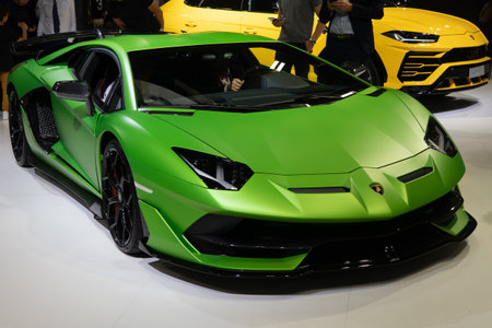 Paris, Ile de France / France - October 07 2018 : Mondial supercar Lamborghini Aventador SVJ Paris Motor Show 2018