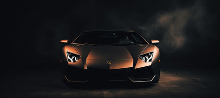 A luxury sports car stands prominently in a dark garage, its sleek lines accentuated by soft lighting, creating an impressive visual contrast against the shadows in the background.