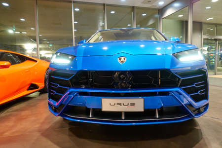 Bologna, Italy - March 03, 2020: Blue Lamborghini Urus sport car in the hall of the Bologna Airport