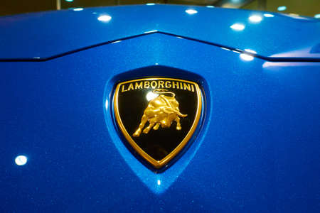 Bucharest, Romania - October 23, 2019: Illustrative editorial close up shot of the Lamborghini logo on a car. Lamborghini is an Italian luxury sports car manufacturer.