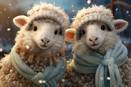 Two cute little lambs in winter hats and scarves on the background of a winter landscape