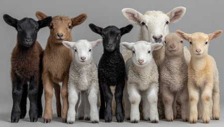 A diverse group of lambs is presented against a plain background. The lambs exhibit a variety of colors, ranging from black and brown to white and beige, with soft textures. The composition features a row of animals, suggesting a studio setting with uniform lighting. Suitable for various commercial and editorial applications.